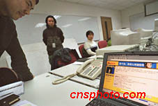 2月5日晚,有“歌壇常青樹”美譽(yù)的臺(tái)灣歌手蔡琴在臺(tái)灣通過長途電話與新浪網(wǎng)友進(jìn)行聊天。蔡琴還將于2月14日至17日在北京領(lǐng)銜主演的大型音樂劇《天使--不夜城》。圖為工作人員在通過電話聯(lián)系蔡琴,電腦里正顯示著有關(guān)蔡琴資料的主頁。中新社圖 陸云 攝