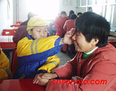 元宵節(jié)來(lái)北京勞教所看望母親的孩子,給曾是法輪功練習(xí)者的媽媽擦拭淚水。中新社圖 王巖 攝