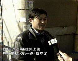 圖文:一名“法輪功”頑固分子16日在京自焚身亡 2001年2月16日 19:06 慘劇現(xiàn)場(chǎng) 目擊者描述慘劇發(fā)生情況(電視截屏畫面) 中新網(wǎng)北京2月16日消息:受李洪志一再叫囂的“升天圓滿”、“忍無可忍”的妖言煽動(dòng)蠱惑,今天12時(shí)許,一名男性“法輪功”頑固分子在北京市海淀區(qū)萬壽路南口路旁,點(diǎn)燃汽油自焚身亡。 公安機(jī)關(guān)初步查明,這名自焚者是來自湖南省常德市的“法輪功”頑固分子,名叫譚一輝,男,漢族,初中文化程度,未婚;家住湖南省常德市城北建民巷117號(hào);身份證號(hào)碼為432401750805303。他是2月15日乘坐長(zhǎng)沙至北京西的T88次空調(diào)硬座特快列車來京的。 |