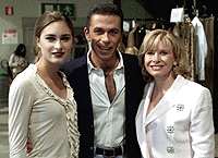 圖文:布什侄女上T臺 米蘭時(shí)裝展成亮點(diǎn) 2001年3月1日 16:39 勞倫(左)、設(shè)計(jì)師馬修羅和她的母親(路透社) 中新網(wǎng)米蘭3月1日消息:米蘭時(shí)裝周進(jìn)行到星期三時(shí),人們發(fā)現(xiàn)了一位T臺新秀——?jiǎng)趥悺げ际?Lauren Bush)。16歲的她可是美國總統(tǒng)小布什的侄女哦。 微笑中透出一點(diǎn)點(diǎn)緊張,勞倫在蓋依·馬修羅(Gai Mattiolo)的2001/2002秋冬時(shí)裝專場上展示了略有些性感的外衣。馬修羅是一位以設(shè)計(jì)性感晚禮服而知名的羅馬設(shè)計(jì)師。 有媒體認(rèn)為,勞倫在臺上略顯稚嫩,還缺乏自如的專業(yè)風(fēng)范。 勞倫是美國總統(tǒng)布什的兄弟尼爾的女兒,而且已經(jīng)是一位攝影模特兒。 “我找她來為我的設(shè)計(jì)作展示,因?yàn)槲矣X得這個(gè)年輕姑娘有一種青春的活力,”馬修羅在勞倫上臺之前對媒體記者說。 勞倫的緊張情緒在這場時(shí)裝展進(jìn)入尾聲時(shí)再也看不到了,馬修羅出來向觀眾們致意,旁邊伴隨著勞倫。她笑得很燦爛。而她的媽媽,則一直在為她鼓掌。 |