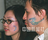 臉上繪有各種圖案的年輕人日前參加北京一間家具店的開業(yè)派對,“體繪”如今已成為年輕人的一種時髦。中新社圖 史利 攝