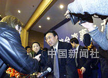 海協(xié)會(huì)秘書(shū)長(zhǎng)李亞飛十六日在出席國(guó)臺(tái)辦的新聞發(fā)布會(huì)后,被中外記者包圍采訪。中新社記者 滿會(huì)喬 攝