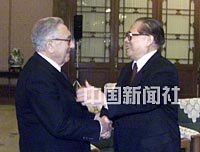 國家主席江澤民二十日在北京人民大會堂會見美國前國務(wù)卿基辛格。中新社記者 李剛 攝