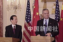 美東時間二十一日晚,中國國務院副總理錢其琛與美國國務卿鮑威爾,在美國國務院大樓舉行會談前會見記者,雙方希望繼續(xù)推進中美兩國關系向前發(fā)展。中新社圖 京華 攝