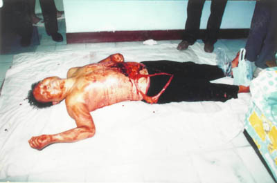 圖:馬健民剖腹尋“法輪” 2001年3月23日 16:55 ![]() 馬健民,男,54歲,華北油田退休職工。其家人稱,馬已練習(xí)“法輪功”兩年左右,達(dá)到了癡迷的程度,時常出現(xiàn)精神恍惚和失常,堅持認(rèn)為自己的腹部有個“法輪”。1998年9月4日馬健民在家中用剪刀剖腹尋找,因救治不及時死亡。這是馬健民自殺后的慘景。新華社發(fā) |
