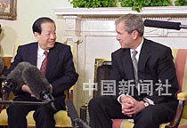 美國總統(tǒng)布什二十二日在白宮會(huì)見中國國務(wù)院副總理錢其琛時(shí)說,他期待著今年秋天到中國訪問。中新社圖 京華 攝