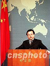 中國外交部發(fā)言人朱邦造四月三日在北京的記者招待會上,談到美國偵察機(jī)一日撞毀中國軍用飛機(jī)事件時說,中國海軍正在全力搜救我方落海飛行員。中新社記者 鄒憲 攝