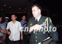 四月四日凌晨一時(shí)許,美國駐華大使館國防武官高喜樂(Gratton sealock)準(zhǔn)將在海口文華大酒店被中外記者追訪。他說:“我們剛剛看望了美國偵察機(jī)機(jī)組人員,他們都很健康,他們身體狀況很好。中國方面給予了妥善安排! 中新社記者 莫成雄 攝