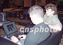 四月三日夜間至四日凌晨,海口文華大酒店中外記者云集,準備采訪美國駐華使館預(yù)定在這里舉行爾后取消的記者招待會。圖為兩名美聯(lián)社記者在現(xiàn)場用電腦發(fā)稿。中新社記者 莫成雄 攝