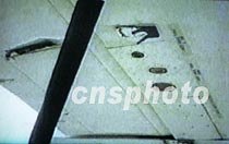 降落在海南的美軍偵察機(jī)機(jī)翼上留下多處肇事痕跡 2001年4月4日 15:46 ![]()