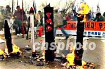 四月七日,韓國市民、學生在首都漢城集會,抗議美國導彈防御系統(tǒng)和日本通過的美化侵略的歷史教科書。圖為示威群眾當眾焚燒了美、日兩國國旗和用紙糊制的導彈模型。中新社圖