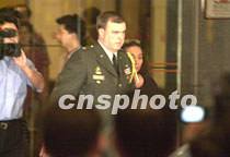 美國(guó)駐華使館國(guó)防武官席樂高準(zhǔn)將十日晚七時(shí)許走出?谖娜A大酒店,乘中方車輛前去與美機(jī)組人員見面。中新社記者 賈國(guó)榮 攝