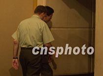 美國(guó)駐華使館武官席樂(lè)高準(zhǔn)將十一日晚十時(shí)四十分在海口文華大酒店新聞發(fā)布會(huì)上說(shuō),現(xiàn)在還不能公布一個(gè)機(jī)組人員離境的時(shí)間表,然后匆匆忙忙從后門(mén)離開(kāi)。中新社記者 賈國(guó)榮 攝