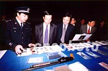 四月十一日下午,深圳市召開嚴(yán)厲打擊刑事犯罪分子宣判處理大會(huì),法院對(duì)四十五名罪犯進(jìn)行終審宣判,公安局對(duì)三十名犯罪嫌疑人執(zhí)行逮捕。圖為廣東省委副書記、深圳市委書記張高麗(左二)和市長于幼軍(左三)等市領(lǐng)導(dǎo)在查看公安部門收繳的槍支、毒品等物。中新社記者 陳文 攝