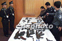 廣東省嚴(yán)打整治斗爭戰(zhàn)果顯著,四月以來,全省共破各類刑事案件五千八百起,抓獲犯罪嫌疑人六千多名,繳獲槍枝一百多支。圖為警方展示近日繳獲的槍械。中新社圖 梁永強(qiáng) 攝