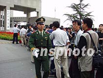 十八日下午在北京外交部門(mén)前等待中美撞機(jī)事件談判消息的中外記者聚集在一起。中新社圖 宋吉河 攝