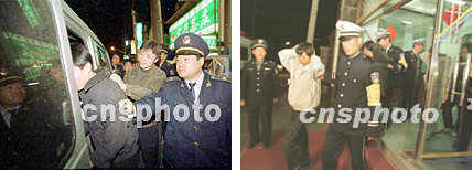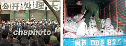 新聞組圖:中國(guó)各地嚴(yán)打行動(dòng) 2001年4月25日 10:04 ![]() 圖(1) 圖(2) ![]() 圖(3) 圖(4) ![]() 圖(5) 圖(6) 圖(1)說(shuō)明:北京西城公安分局、工商局日前聯(lián)合在夜間清理音像市場(chǎng),當(dāng)場(chǎng)抓獲販賣盜版光盤(pán)人員十余名。中新社記者宋吉河攝 圖(2)說(shuō)明:北京公安西城公安分局日前夜間收容外地進(jìn)京“三無(wú)”人員,全面整頓社會(huì)治安。中新社記者宋吉河攝 圖(3)說(shuō)明:重慶市巴南區(qū)二十四日在電影院廣場(chǎng)前公開(kāi)審判十九名刑事犯罪分子,上千名當(dāng)?shù)厝罕妳⒓恿舜髸?huì),無(wú)不拍手稱快。中新社記者趙振清攝 圖(4)說(shuō)明:福清市公安邊防大隊(duì)官兵,23日凌晨在“治爆緝槍專項(xiàng)行動(dòng)”中,先后破獲二起特大偷運(yùn)、私藏炸藥案,共查獲土制銨油炸藥5000多公斤、雷管283枚、導(dǎo)火索250米。圖為一名邊防警員在福清海口鎮(zhèn)方新村官下尾路段攔檢一輛裝載有土制銨油炸藥的可疑貨車。中新社圖賀錕陳暉攝 圖(5)說(shuō)明:中國(guó)重慶市巴南區(qū)二十四日在該區(qū)電影院廣場(chǎng)前公開(kāi)審判十九名刑事犯罪分子,當(dāng)?shù)厣锨忻駠^犯罪分子被押上刑車,送往監(jiān)獄的過(guò)程。中新社記者趙振清攝 圖(6)說(shuō)明:中國(guó)重慶市巴南區(qū)二十四日在該區(qū)影院廣場(chǎng)公開(kāi)審判十九名刑事犯罪分子,當(dāng)?shù)厍忻瘳F(xiàn)場(chǎng)目睹犯罪分子被押上刑車,送往監(jiān)獄的過(guò)程。中新社記者趙振清攝 |