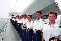 中國海軍海上隆重祭奠“海空衛(wèi)士”王偉烈士活動,二十六日中午在海南省三亞市附近海域隆重舉行。509號導彈護衛(wèi)艦官兵脫帽肅立,為英雄王偉送行。中新社圖 張全躍 攝