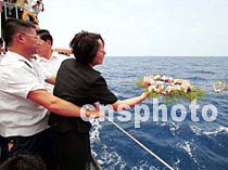 中國海上祭奠王偉烈士活動二十六日在海南三亞近海舉行。王偉夫人阮國琴淚灑大海,向王偉離去的方向拋去花環(huán)。中新社圖 張全躍 攝