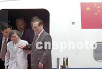 參加“2001年《財富》全球論壇”的中國國家主席江澤民與夫人王冶坪,5月8日中午乘專機抵達香港機場,香港特區(qū)行政長官董建華與夫人登機迎接。 中新社傳真 任晨鳴 攝
