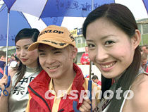 中國香港車手周浩云(中)與內(nèi)地名模金姝懿(右)、王茵(左)在捷克布諾賽車場(chǎng),為中國宗申摩托車隊(duì)取得歷史性好成績喜笑顏開。中新社圖 方迎忠 攝
