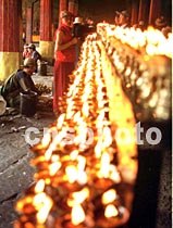 在今夏的旅游旺季,一些到西藏寺廟觀光的游客按照藏族的習(xí)俗向佛像敬獻酥油燈,祈求平安。中新社記者 宋吉河 攝