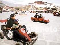 西藏拉薩市布達(dá)拉宮前的廣場,成為休假日人們游樂的場所。兩位藏族兒童假日在廣場上開著小卡丁車,玩得十分高興。中新社圖 吳新華 攝