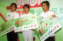 影星周星馳、本地甲組足球員丘健威(右)、陳豪文(左)8日在香港出席“2001麥當勞青少年足球推廣”記者會,獲邀出任足球大使,協(xié)助青少年足球推廣活動。中新社傳真 鄧慶樂 攝