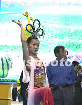扮演唐朝反彈琵琶的飛天女,十日在中國(guó)西部甘肅省的展臺(tái)前起舞,為北京國(guó)際科技博覽會(huì)的綠色工程助興。中新社記者 賈國(guó)榮 攝