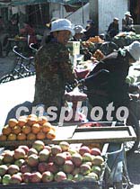 西藏拉薩五月的街頭,小販在叫賣著新鮮的水果。如今藏族人的生活水平日漸提高,購買空運的時鮮蔬果已經(jīng)不再是困難的事情。中新社記者 滿會喬 攝
