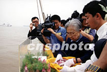 杰出的愛國宗教領(lǐng)袖、原全國政協(xié)副主席、民進中央名譽主席趙樸初因病于2000年5月21日在北京逝世。根據(jù)趙樸初的遺愿,他的骨灰于6月2日撒在上海吳淞口的大海。圖為趙樸初的夫人陳邦織捧起骨灰撒向大海。中新社圖 郭海鵬 攝