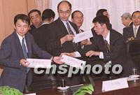 ![]() 參加中日貿(mào)易問題談判的日方人員三日下午在北京外經(jīng)貿(mào)部談判大樓參加中日貿(mào)易問題的正式磋商時,臨時調(diào)整自己的坐次。中新社記者 鄒憲 攝