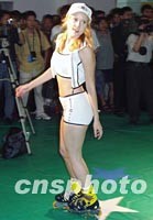 圖:外籍模體在育用品博覽會上 2001年07月07日 17:36 ![]() 正在北京舉行的2001中國國際體育用品博覽會上,各參展商在展臺上推出商品展示。圖為曼奴服飾集團展位上身穿運動服的外國模特。中新社記者 錢興強 攝