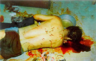 圖:練“法輪功”害人害己 2001年07月26日 20:15 ![]() 家住河北承德市桃李街的李亭受“法輪功”的欺騙,認(rèn)為自己的父母是“惡魔”,他自己是“佛”!胺稹币选皭耗А背,遂用尖刀將父母殺死。圖為被害者李亭之父。新華社發(fā) 馬健民,男,54歲,華北油田退休職工。其家人稱,馬已練習(xí)“法輪功”兩年左右,達(dá)到了癡迷的程度,時(shí)常出現(xiàn)精神恍惚和失常,堅(jiān)持認(rèn)為自己的腹部有個(gè)“法輪”。1998年9月4日馬健民在家中用剪刀剖腹尋找,因救治不及時(shí)死亡。這是馬健民自殺后的慘景。新華社發(fā) |