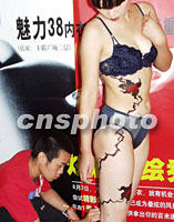 圖:“魅力38內(nèi)衣”人體彩繪 2001年08月03日 17:50 ![]() 北京“魅力38內(nèi)衣”,三日在北京豐聯(lián)廣場開設(shè)京城第二家分店,一名畫師聚由海外公司合作開辦的北京“魅力38內(nèi)衣”,三日在北京豐聯(lián)廣場開設(shè)第二家分店。圖為一名畫師正聚精會神為身穿內(nèi)衣的模特小姐繪畫。中新社記者 錢興強 攝