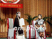 十二歲的沙霏(左)和她的同學(xué)九日晚在北京長安大戲院表演京劇《六月雪》片段,沙霏在劇中的精彩表演剛為她贏得北京第四屆少兒京昆大賽一等獎。目前,中國國內(nèi)越來越多的少兒開始喜歡國粹京劇。中新社圖 武仲林 攝