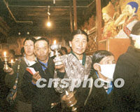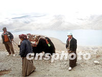 組圖:八月的西藏 2001年08月14日 16:50 ![]() 八月是西藏旅游的黃金季節(jié),藏民牽著牦牛在美麗的羊卓雍湖邊迎候游人,他們以為游客提供照相服務(wù)而增加自己的收入。中新社記者 滿會(huì)喬 攝 ![]() 八月的西藏拉薩,前往大昭寺朝拜釋迦牟尼佛像的藏民絡(luò)繹不絕。相傳這里供奉的釋迦牟尼佛像為唐朝初年文成公主帶入西藏。中新社記者 滿會(huì)喬 攝