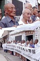 中國江蘇省崇山村村民,十五日在村委會前集會,抗議日本首相小泉參拜供奉著二戰(zhàn)甲級戰(zhàn)犯的靖國神社。日本侵華期間,有上百名崇山村民,無辜慘死在日本于此地進(jìn)行的細(xì)菌戰(zhàn)之中。