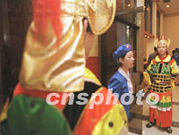圖:“唐兵”把守西部論壇會(huì)場顯盛世威嚴(yán) 2001年09月06日 15:09 ![]() 西安兩名身扮唐代武士的門衛(wèi)在九月西部論壇分會(huì)場唐樂宮值勤,以渲染唐代氣氛顯示當(dāng)今魅力。中新社記者 宋吉河 攝 |