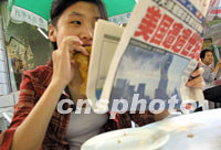 組圖:北京市民關(guān)注美國“爆炸事件” 2001年09月12日 10:25 ![]() 十一日發(fā)生的美國受襲“爆炸事件”引起了北京媒體的全面關(guān)注,十二日清晨報攤攤主高舉報紙頭版向路人吆喝。中新社記者 鄭萍萍 攝 ![]() 十二日清晨,在路邊吃早餐的北京市民關(guān)注當日報紙所載美國“爆炸事件”。中新社記者 鄭萍萍 攝