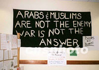 圖:美國(guó)一些校園出現(xiàn)反戰(zhàn)看板 2001年09月23日 15:32 ![]() 美國(guó)一些著名大學(xué)近日舉行和平集會(huì),呼吁政府勿用戰(zhàn)爭(zhēng)手段報(bào)復(fù)恐怖襲擊事件,以免傷害無(wú)辜。圖為紐約市立大學(xué)亨特學(xué)院的看板上寫(xiě)著:“阿拉伯人和穆斯林并不是我們的敵人,戰(zhàn)爭(zhēng)不是解決問(wèn)題的辦法!敝行律鐖D |