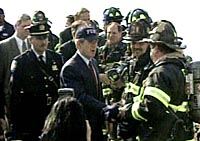 圖文:恐怖襲擊事件后布什第二次訪問紐約 2001年10月04日 09:51 ![]() 美國總統(tǒng)布什三日清晨來到紐約。他一下飛機,就頭戴印有“紐約市消防局”字樣的棒球帽,和參加救援與清理工作的人們握手。“九一一”恐怖襲擊案三周來,布什現(xiàn)已兩次訪問紐約。