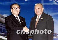 圖:江澤民迎接中國香港特別行政區(qū)行政長官 2001年10月21日 11:35 ![]() 10月20日,中國國家主席江澤民在上海國際會議中心迎接中國香港特別行政區(qū)行政長官董建華。中新社圖 |