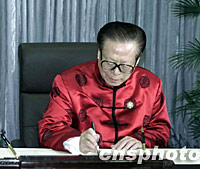圖:江澤民簽名留念 2001年10月21日 17:29 ![]() 10月21日,出席2001年亞太經(jīng)合組織領(lǐng)導(dǎo)人非正式會(huì)議的中國國家主席江澤民在上?萍拣^簽名留念。中新社圖 |