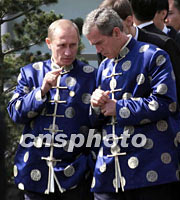 10月21日,出席亞太經合組織領導人非正式會議的俄羅斯總統(tǒng)普京和美國總統(tǒng)布什在會議間隙交談。中新社圖