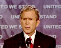 布什發(fā)表演講 呼吁美國民眾恢復(fù)正常生活 2001年11月09日 18:31 ![]() 布什8日在亞特蘭大發(fā)表全國講話說,一個四歲的小女孩曾寫信問他:"那些人都不知道我們是誰就攻擊我們。我們干嘛不告訴他們我們叫什么呢?"布什接著說:"我們會告訴那些恐怖分子我們是誰的,我們會告訴他們美國是誰。"布什的講話引來在場五千名聽眾起立鼓掌。