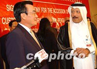 圖:WTO總干事對中國臺北加入世貿(mào)組織表示祝賀 2001年11月13日 10:08 ![]() 第四屆WTO部長級會議十二日在多哈舉行中國臺北加入世貿(mào)組織議定書簽字儀式。圖為會議主席卡塔爾財政、經(jīng)濟和貿(mào)易大臣卡邁爾,WTO總干事穆爾等向臺北代表團團長林信義表示祝賀。中新社記者 錢興強 攝 |