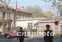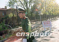 圖文:紐約空難后美國(guó)駐華大使館擴(kuò)大警戒范圍 2001年11月13日 15:37 ![]() 北京警方13日在美國(guó)駐中國(guó)大使館前增加警力并擴(kuò)大了警戒范圍,幾條通往使館門(mén)前的道路都設(shè)置了路障,禁止行人和車輛通行。美國(guó)美洲航空公司一架空中客車十二日在紐約墜毀,是否與恐怖主義襲擊有關(guān)仍有待進(jìn)一步調(diào)查。中新社圖 武仲林 攝 ![]() 美國(guó)墜機(jī)事件后,中國(guó)軍方十三日對(duì)位于北京建國(guó)門(mén)外的美國(guó)使館區(qū)加強(qiáng)安保工作!熬乓灰弧焙笠恢睂(shí)行戒嚴(yán)的美使館區(qū)內(nèi)秩序安定。中新社圖 劉殊瑾 攝