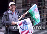 紐約世貿(mào)大樓廢墟前小販?zhǔn)燮欤颉熬乓灰弧笔录入y現(xiàn)場的英雄們致敬,也預(yù)祝美國民眾有個(gè)祥和愉快的圣誕節(jié)。中新社記者 徐德金 攝