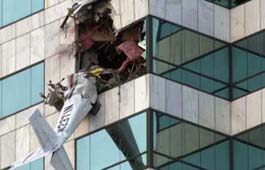 未獲批準(zhǔn)強(qiáng)行起飛 美15歲高中生駕機(jī)撞樓(圖) 2002年01月06日 09:17 ![]() 撞樓現(xiàn)場 中新網(wǎng)北京1月6日消息:外電報道說,一架小型飛機(jī)5日下午撞進(jìn)美國佛羅里達(dá)州坦帕市一棟40層大樓后墜毀。墜毀飛機(jī)的駕駛員是一個15歲的高中生。根據(jù)當(dāng)?shù)胤梢?guī)定,他不能單獨(dú)駕駛飛機(jī)。 據(jù)美聯(lián)社報道,雖然聯(lián)邦調(diào)查局初步認(rèn)為此次飛機(jī)撞擊大樓事件與恐怖主義無關(guān),但仍派遣了調(diào)查人員前往現(xiàn)場。 美國海岸警衛(wèi)隊官員說,這架飛機(jī)是在沒有獲得有關(guān)當(dāng)局批準(zhǔn)的情況下起飛的,而且駕駛員對要求其降落的信號置之不理。海岸警衛(wèi)隊直升飛機(jī)隨即對這架單引擎飛機(jī)進(jìn)行了跟蹤飛行。當(dāng)時,兩架飛機(jī)距離最近時只有幾米。海岸警衛(wèi)隊官員皮特曼毫不懷疑小型飛機(jī)上的駕駛員明白直升飛機(jī)要求其降落的信號。 目前還沒有關(guān)于人員傷亡的報道,大樓在撞擊后沒有起火。飛機(jī)的機(jī)尾還懸掛在大樓外側(cè)。 |